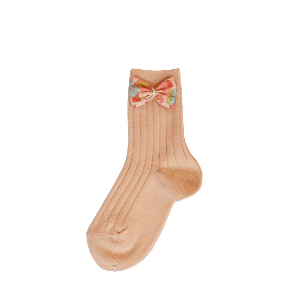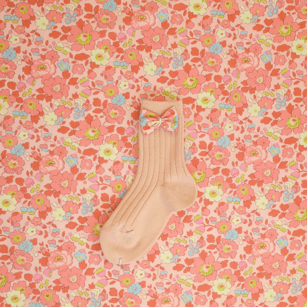 Super soft wide ribbed soft peach cotton ankle socks with a beautiful Liberty fabric bow in Betsy in coral on the top of each sock.