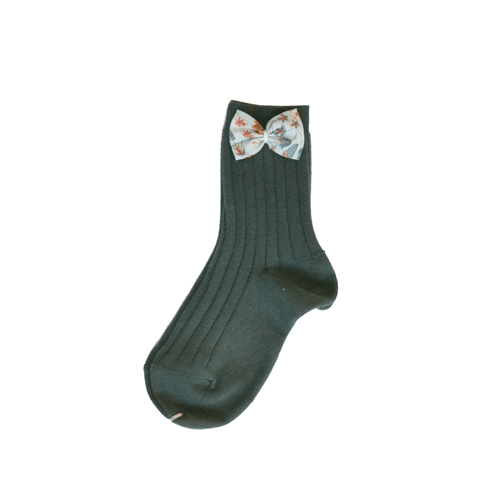 Super soft wide ribbed racing green cotton ankle socks with a beautiful Liberty fabric bow in Donna Leigh on the top of each sock.