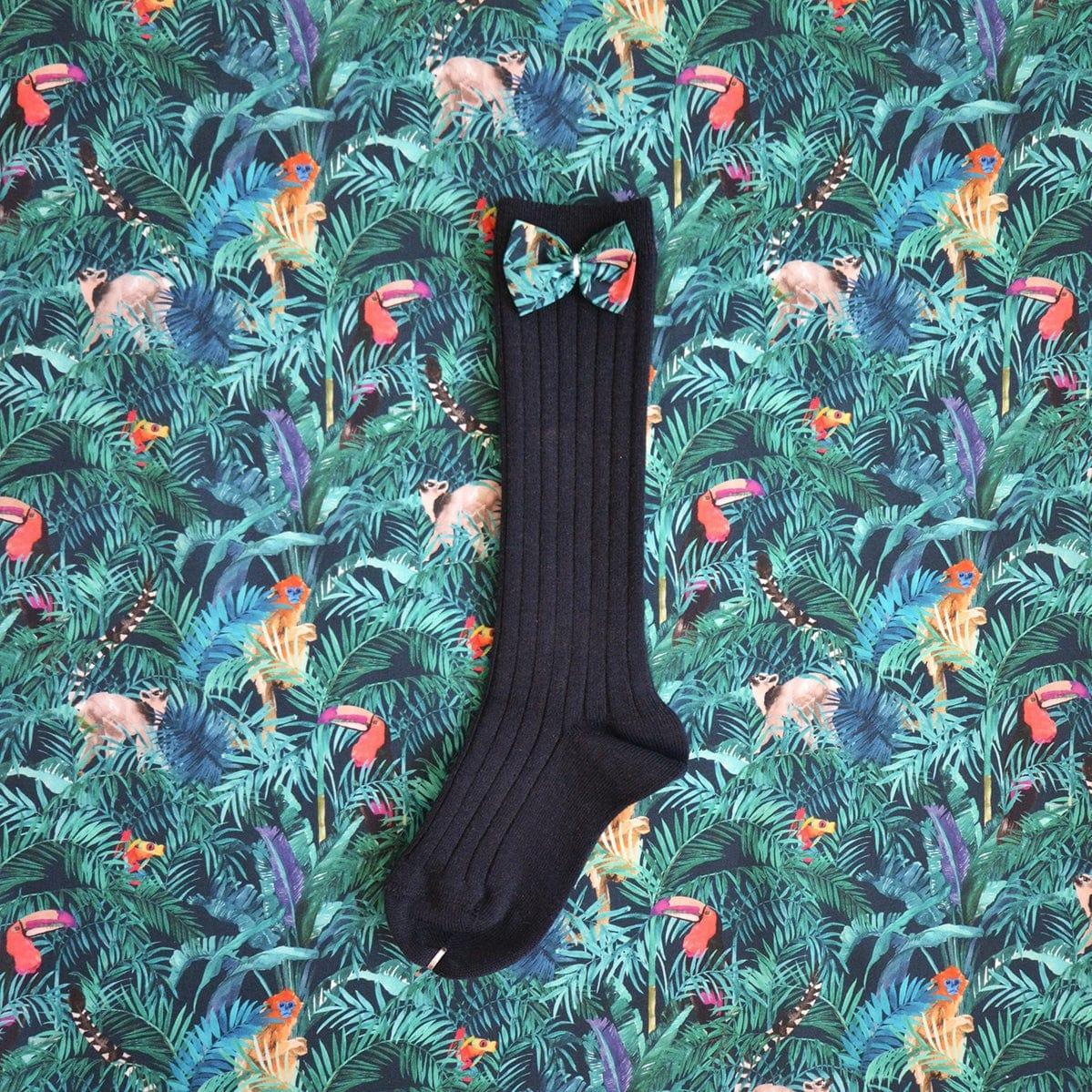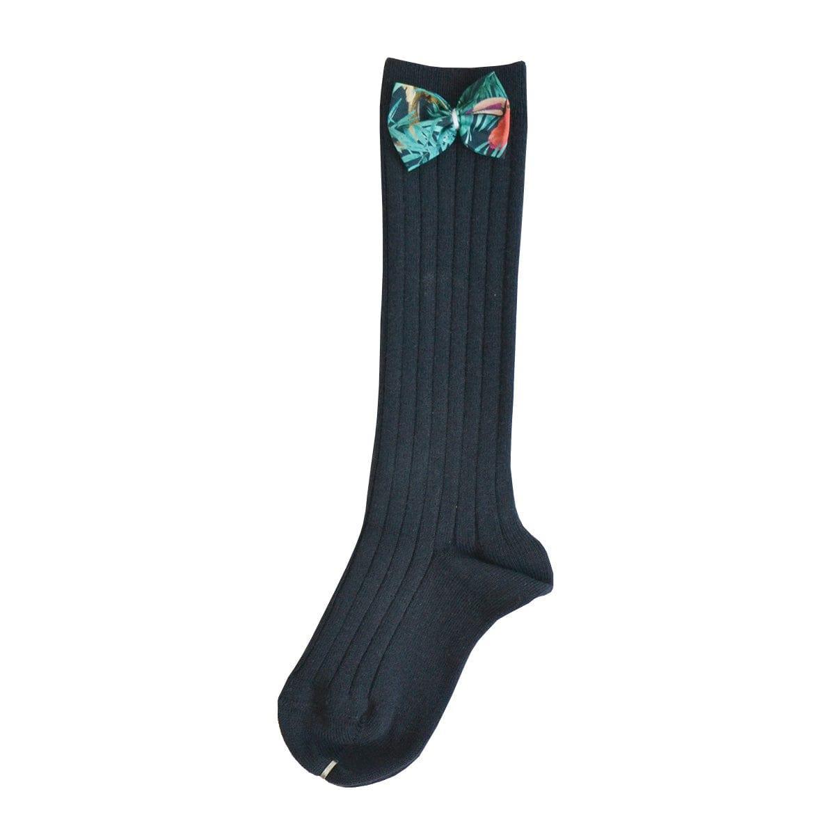 Super soft wide ribbed deep navy cotton knee high socks with a beautiful Liberty print Tana Lawn® bow in Tou-Can Hide on the top of each sock.