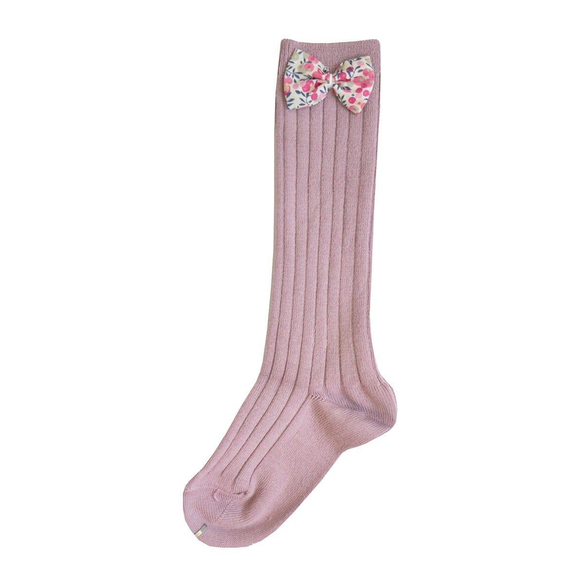 Super soft wide ribbed lavender colour cotton knee high socks with a beautiful Liberty print Tana Lawn® bow in Wiltshire Bud magenta on the top of each sock.