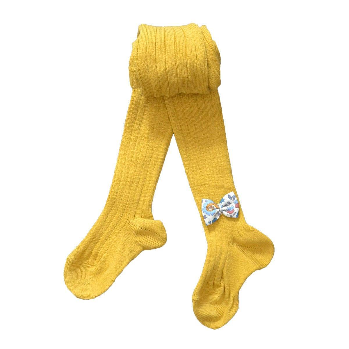 Super soft wide ribbed rich mustard cotton tights with a beautiful Liberty fabric bow in D'Anjo on the ankle.