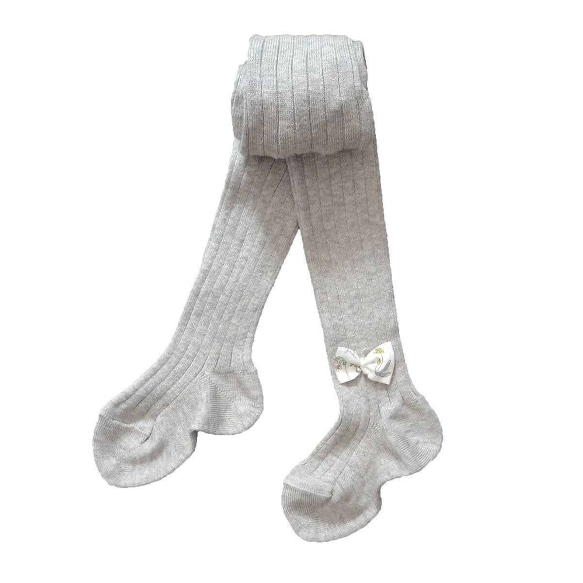 Super soft wide ribbed sumptuous light grey marl cotton tights with a beautiful Liberty fabric bow in Theo on the ankle.