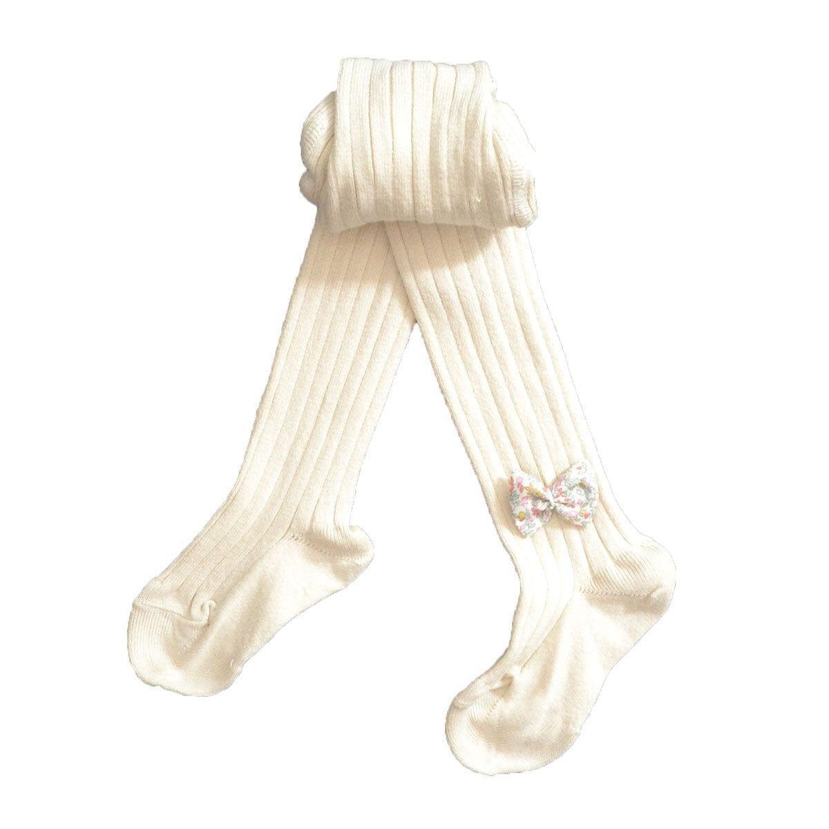 Super soft wide ribbed sumptuous buttermilk cotton tights with a beautiful Liberty fabric bow in Katie & Millie pink on the ankle.