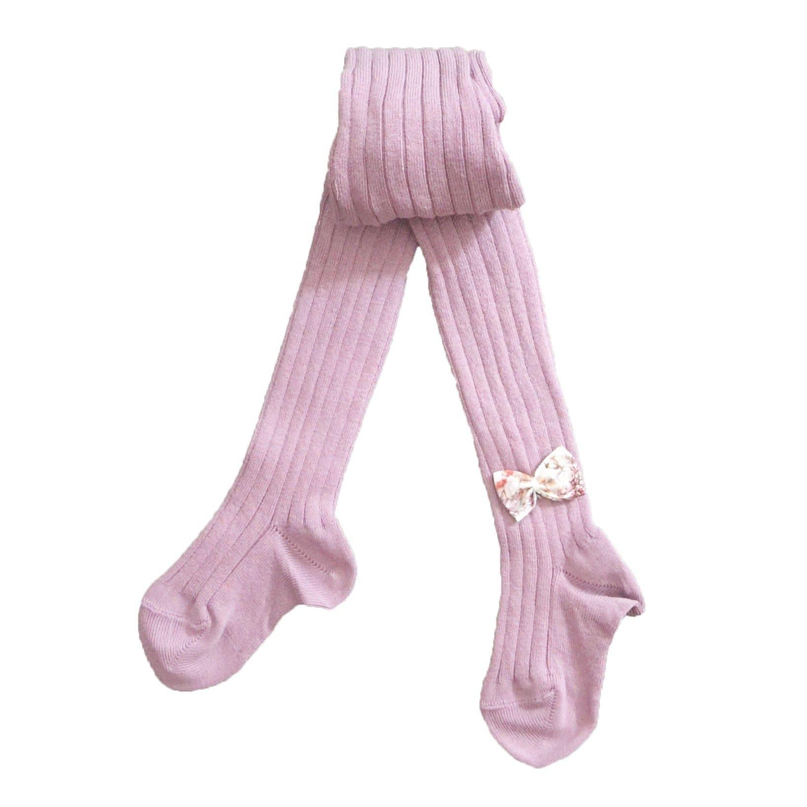 Super soft wide ribbed sumptuous lavender cotton tights with a beautiful Liberty fabric bow in Wild Flowers pink on the ankle.
